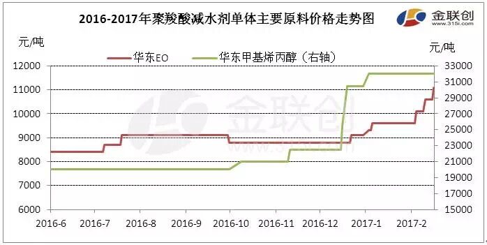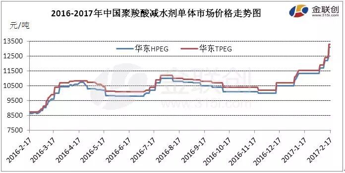由上图可见,进入2017年以来我国聚羧酸减水剂单体市场价格连续攀涨,整体涨幅达2600元/吨。截至今日收盘,聚羧酸减水剂单体市场华东地区TPEG报盘参考13200-13400元/吨,HPEG参考13000-13200元/吨;东北地区TPEG出厂报盘参考12700-13000元/吨,HPEG报盘参考12500-12800元/吨,实单成交商谈让利空间有限。